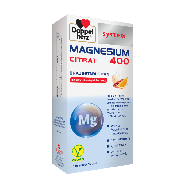 Doppelherz System MAGNEZIJ 400 CITRAT je prehransko dopolnilo z magnezijem, vitaminom B6 in vitaminom C. Prehransko dopolnilo je shranjeno v obliki šumečih tablet, ki jih preprosto raztopite v vodi, spijete in s tem zadostite dnevni potrebi po magneziju.